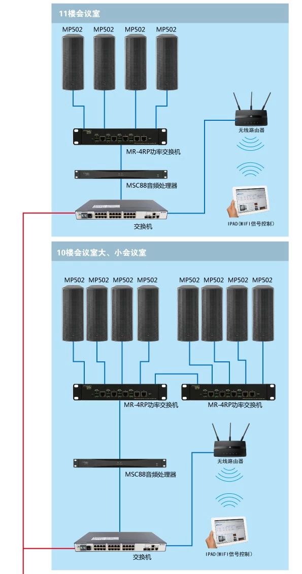 在此次項目設計中,工程商選用了Mission Pro MP全頻系列中的MP-502作為會議室和多功能廳的主擴揚聲器。MP-502為雙5.5寸有源壁掛音箱,內(nèi)置Dante與D類功放模塊,通過一根網(wǎng)線進入系統(tǒng)MR-4RP功率交換機;MR-4RP通過網(wǎng)線連接MSC-88音頻處理器,最終通過網(wǎng)線連接主交換機,無需輸出模擬信號,通過Dante網(wǎng)絡傳輸協(xié)議進行數(shù)據(jù)處理。整座大廈采用了整合性極高的多功能分布式云控制系統(tǒng)。