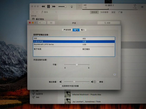圖20:這里用的是OS系統自帶播放器,有些播放器可能需要在軟件本身再做一次聲卡輸出的選擇。另WIN系統也一樣要先把系統聲音輸入輸出選項有電腦本身揚聲器改為LX10調音臺聲卡;低版本的WIN系統有可能還需要安裝LX10聲卡驅動。