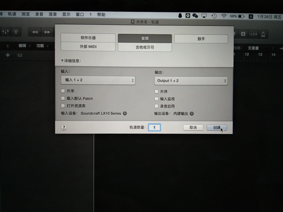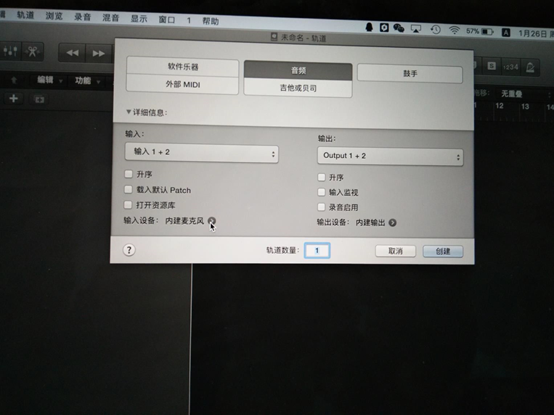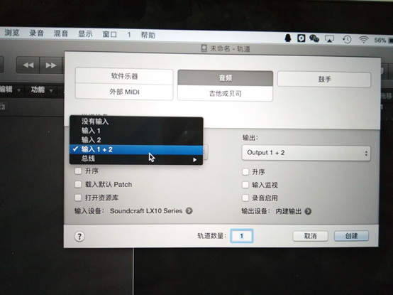 圖27:設備選擇好后選擇輸入通道,可以選擇單通道(這樣的話就要建兩個軌道)這里選擇的是1+2模式一個軌道錄制立體聲。選擇好后入圖28所示。