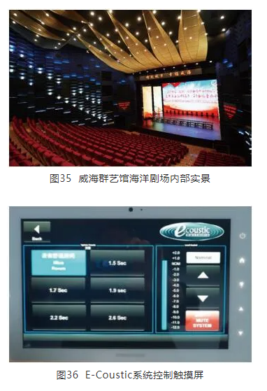 如前所述,E-Coustic系統(tǒng)基于世界最著名的專業(yè)混響器研發(fā)生產(chǎn)企業(yè)Lexicon而來(lái),其獨(dú)到的混響算法為這種嵌入式系統(tǒng)提供了一個(gè)非常好的再生聽(tīng)感,同時(shí)E-Coustic先進(jìn)的時(shí)變技術(shù),也很好地保證了系統(tǒng)的穩(wěn)定性。本系統(tǒng)中,傳聲器與揚(yáng)聲器的距離很近,但很好地抑制了聲反饋和聲染色的問(wèn)題。同時(shí)系統(tǒng)使用較少的傳聲器-揚(yáng)聲器通路,即能達(dá)到改變聲學(xué)環(huán)境的效果,也很大程度的降低了施工難度,這也是嵌入式系統(tǒng)的固有優(yōu)勢(shì)之一。威海市群藝館海洋劇場(chǎng)內(nèi)部實(shí)景及E-Coustic控制觸摸屏分別如圖35和圖36所示。