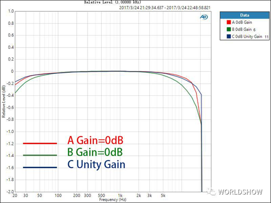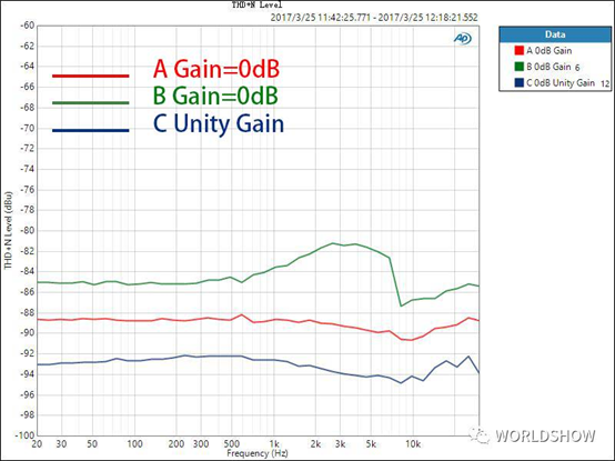 從上面三張圖可以看出:A、B兩張臺的話放是類似的設(shè)計(jì),只是本底噪聲和失真不同; C調(diào)音臺雖然本底噪聲最低,但在高增益的情況下失真在整個中頻段增加明顯,說明C調(diào)音臺話放設(shè)計(jì),不如A調(diào)音臺。