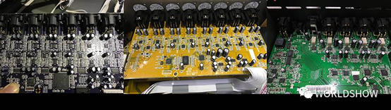 通過上述測試對比,我們可以基本判斷,在各項(xiàng)性能上,C的指標(biāo)最高,A其次,B型號最低。這些指標(biāo)對用戶的意義是什么呢?——是音質(zhì)的差別,而這背后是電路設(shè)計(jì)和電路元器件的選用上差別。對于數(shù)字調(diào)音臺來說,話放的電路設(shè)計(jì)和元器件選用,A/D、D/A轉(zhuǎn)換芯片,這些很大程度上決定了其性能。入門級的調(diào)音臺為了實(shí)現(xiàn)大眾化的價格,往往不得不在音質(zhì)和成本之間折中。我們分別將手頭的3個型號的調(diào)音臺的進(jìn)行拆機(jī),分別看看其電路設(shè)計(jì)和元器件用料。