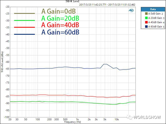 圖4. A型號調(diào)音臺話放增益在不同時的THD+N Level