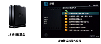 您也可以選擇播放外掛的2T多媒體硬盤上的內(nèi)容。2000G的海量存儲(chǔ)空間,可存儲(chǔ)成百乃至上千部的海量電影、電視劇、音樂CD等等,內(nèi)容可以自由拷貝、隨時(shí)更新。可以滿足家人所有要求,有孩子動(dòng)畫片、年輕人喜歡的好萊塢大片、妻子喜歡的愛情片和連續(xù)劇、父母喜歡的戲曲或經(jīng)典老片等等。