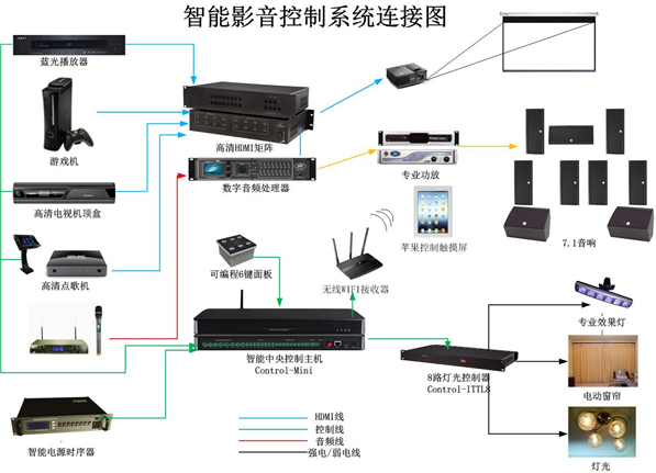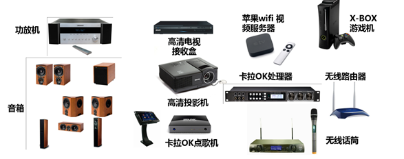 1)投影機(jī)、高清藍(lán)光播放機(jī)、點(diǎn)歌機(jī)、互動(dòng)游戲機(jī)、高清電視機(jī)頂盒、卡拉OK機(jī)、無線話筒、功放機(jī)、空調(diào)機(jī)、網(wǎng)絡(luò)路由器等等多達(dá)十幾種設(shè)備;