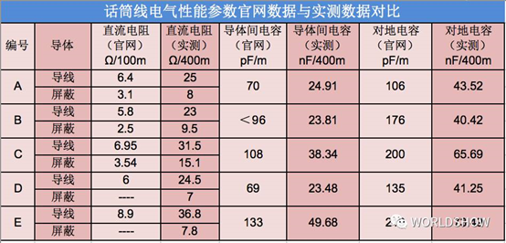 表2:五款線材的電氣性能參數官網與實測數據對比,注意單位的區別。