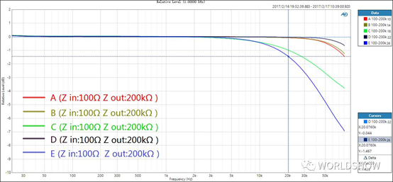 通過以上兩幅測試對比,我們基本可以了解專業音頻系統中話筒線對信號傳輸質量的影響,主要表現在高頻的衰減上。而對于非專業設備、輸出阻抗設計不合理或被錯誤設置到很高的情況下,會發生怎樣的改變?