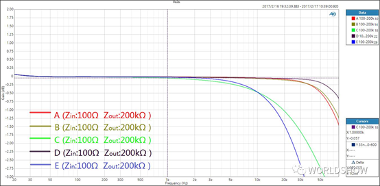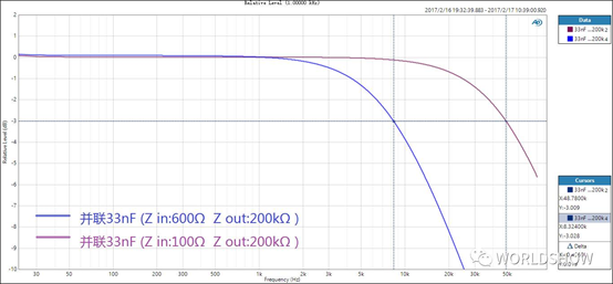 可以看到,-3 dB衰減頻率為8.25 kHz,而在20 kHz的衰減達到-8.28 dB!這樣的衰減會丟失重要的高頻成分,使聲音完全失去色彩,是絕不可接受的。可是為什么會這樣?我們回到公式中計算一下,當輸出阻抗由100Ω調整到600Ω,電路總電阻為: