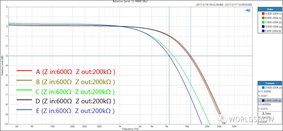 圖中可以看到,輸出阻抗為600Ω時,所有五款線材在音頻范圍內都有明顯的衰減,傳輸線路的幅頻響應看上去像是專門設計的低通濾波器了。表現最好的是D號線,其截止頻率為11.3 kHz,最差的是E號線,截止頻率在5.4 kHz。這樣的高頻衰減,在實際的系統中當然是決不允許的。好在這種情況在高品質的專業級音頻設備中通常不會發生,這些設備通常有設計合理的輸出阻抗。