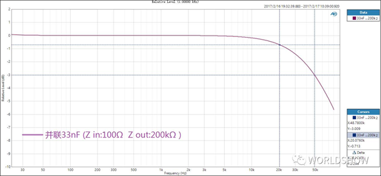 圖3:0.5m信號線,在卡儂頭2腳(熱端)和3腳(冷端)并聯一個33nF電容的幅頻響應。