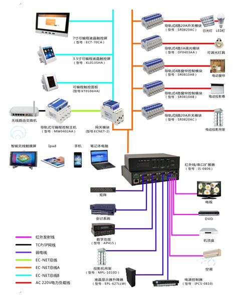 由若干個EC-NET總線A電箱,總控室EC-NET總線B,及主機、網關的系統模塊構成。