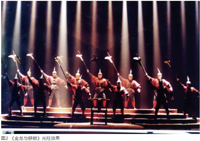例如,在征戰(zhàn)這場(chǎng)戲中,選用16臺(tái)par燈,放在舞臺(tái)后區(qū),根據(jù)打擊樂的節(jié)奏,借助煙霧,與演員動(dòng)作緊密結(jié)合之后,在空間形成16道光柱,以寫意和抽象的方式表達(dá)征戰(zhàn)的勝利(圖2)。現(xiàn)在看來(lái),16臺(tái)par燈,太少了。但在那個(gè)年代,整場(chǎng)演出用燈超過60臺(tái),就算是大制作。如果16臺(tái)par燈僅用一次,作為特殊效果燈而存在,那不是太少,而是太多了。一方面,由于當(dāng)時(shí)條件受限,每一臺(tái)燈都需要爬大約8 m高梯子對(duì)光,非常危險(xiǎn);另一方面,燈光設(shè)計(jì)具有繪畫能力、造型能力,每一組燈都是在特定場(chǎng)景中布置的特殊效果燈,都是為了某個(gè)特定場(chǎng)景而存在,所以每一臺(tái)燈或每一組燈,都有非常明確的使用目的。筆者這代人在燈光設(shè)計(jì)過程中,受到的是特殊效果燈的訓(xùn)練。如果要使特殊效果燈起作用,必須精讀文本,且要在排練場(chǎng)看彩排,深入了解導(dǎo)演所有的場(chǎng)面調(diào)度和處理。只有這樣,燈光設(shè)計(jì)才能做到心中有數(shù),才敢用一個(gè)燈投射下去,并把規(guī)定情境的思想情感與形式美感表達(dá)出來(lái)。