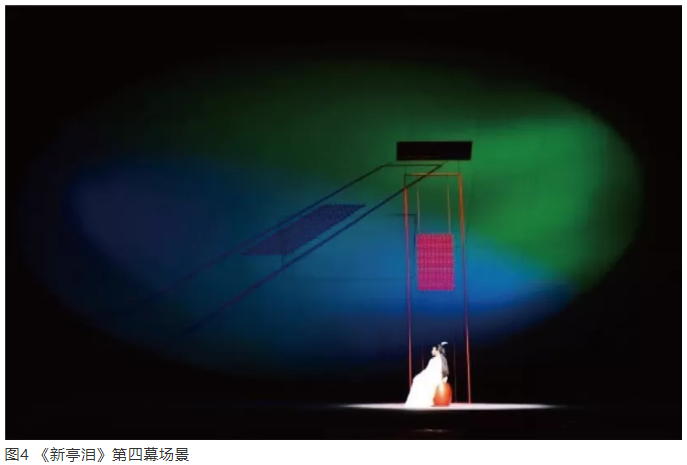 另外,中國(guó)的舞臺(tái)燈光現(xiàn)在已經(jīng)有其應(yīng)有的美學(xué)品格。在該劇中,筆者采用中國(guó)傳統(tǒng)青山綠水的設(shè)色方式,營(yíng)造空間氣氛,借以傳達(dá)中國(guó)藝術(shù)氣質(zhì)和精神。如第四幕閨房中,上場(chǎng)門流動(dòng)的藍(lán)色光與下場(chǎng)門頂側(cè)的綠色光,在大圓盤不同區(qū)位的染色過程中,根據(jù)光源的明亮變化程度和色彩的衰減漸變,營(yíng)造美輪美奐的光色影變化(圖4)。
