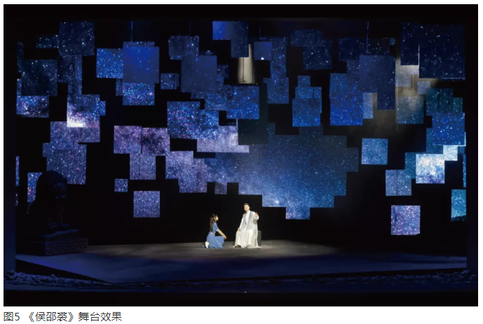在劇本解讀后,主創(chuàng)團(tuán)隊(duì)提煉了16個(gè)字“瘡痍大地”“迷霧漫漫”“流星飛逝”“光耀千秋”,作為形象創(chuàng)作的出發(fā)點(diǎn)。為了創(chuàng)造“瘡痍大地”“迷霧漫漫”“流星飛逝”的效果,舞美做了大膽嘗試。地面上是一塊傾斜的腐蝕的鋼板,周圍有一些碎石。傾斜的臺(tái)面、腐蝕的鋼板,暗喻滿目瘡痍、風(fēng)雨飄搖的中華大地。在舞臺(tái)空間采用13道吊桿,每道吊桿都參差懸掛大小不等的一塊塊LED屏,在空間吊掛不同層次的LED小屏,帶有裝置藝術(shù)的意味和觀念,充滿一種意象和現(xiàn)代感(圖5)。由于這些LED屏幕組塊在空中吊掛的高度、縱深不同,以至于所有的完整形象投射到這個(gè)屏幕之后,都會(huì)產(chǎn)生支離破碎的不完整之感,以此來(lái)表達(dá)主創(chuàng)團(tuán)隊(duì)對(duì)劇本形象的開掘。讓人物性格精神的成長(zhǎng)生活在特定的空間環(huán)境中,是戲劇震撼人心的必要前提。所以,沒有設(shè)計(jì)描繪性的動(dòng)作環(huán)境空間,而是提煉出一個(gè)隱喻和象征性的空間,運(yùn)用局部的破碎形象暗示劇情的環(huán)境。