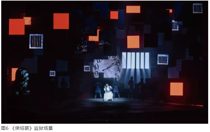 比如,劇中監(jiān)獄窗格透出的光束形象是屏幕形象,而不是燈光光影形象(圖6)。它是一種光景,借助多媒體手段創(chuàng)造的環(huán)境形象。在這個(gè)屏幕形象呈現(xiàn)過程中,舞臺(tái)燈光也創(chuàng)造與其相一致的光影效果,通過視覺錯(cuò)視,使平面和立體效果產(chǎn)生關(guān)系,進(jìn)而形成渾然一體的戲劇動(dòng)作空間。多媒體的形象和燈光的形象是一體的,而且多媒體形象作為一個(gè)完整的形象,視覺效果特別奪目,在信息傳遞上又特別有效。對(duì)于當(dāng)代的燈光設(shè)計(jì),多熟悉多媒體技術(shù)和手段,是很有價(jià)值的。現(xiàn)代戲劇有一個(gè)顯著的特征,不是手段匱乏,而是手段太多。在戲劇空間中,如何節(jié)制地運(yùn)用技術(shù)手段,是當(dāng)代舞臺(tái)空間演出中一個(gè)特別值得思考的話題。