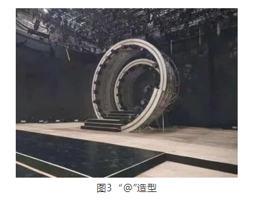 燈光設(shè)計(jì)既考慮整體協(xié)調(diào),又要獨(dú)立體現(xiàn)。主會(huì)場(chǎng)舞美設(shè)計(jì)為360°全景沉浸式舞臺(tái),在整體空間內(nèi)包含多個(gè)獨(dú)立空間。在不同空間內(nèi),通過多燈種、多方位、多結(jié)構(gòu)的組合布光方式,營(yíng)造不同氛圍和環(huán)境光。舞臺(tái)表演區(qū)頂層由LED帕燈、染色燈、光束燈、圖案切割燈組成;舞臺(tái)正中的“@”圓形造型由光束燈、LED帕燈、LED變色燈帶組成(圖3);觀眾席兩側(cè)有“書房”“客廳”,用洗墻燈營(yíng)造房間氛圍,沙發(fā)旁放上一盞落地?zé)糇鼍植空彰鳎块g頂上有一只吊燈做裝飾。錄制過程中,沒有互動(dòng)時(shí)都是剪影呈現(xiàn),觀眾席每一張圓桌正上方都有一只電腦燈進(jìn)行氛圍照明。