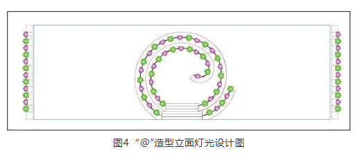 舞美造型“@”是舞美設(shè)計(jì)中特別重要的元素,當(dāng)一個(gè)超大“@”造型出現(xiàn)在舞臺(tái)上,壓縮了舞臺(tái)表演活動(dòng)空間,為燈光處理帶來難題。若需要大面積進(jìn)行照明,“@”造型會(huì)非常突兀地出現(xiàn)在鏡頭里,破壞舞美的空間層次。這時(shí),原本燈光設(shè)計(jì)的問題就凸顯出來,燈位角度過小,使得表演區(qū)人物下頜面部陰影比較長(zhǎng)。在施工現(xiàn)場(chǎng)又增加了面光,通過多道面光組合及光比控制,保證人物及景區(qū)的正常曝光,體現(xiàn)空間的立體層次感(圖4)。在“@”圓環(huán)燈帶線條的基礎(chǔ)上,安裝小光束燈,在光結(jié)構(gòu)上形成點(diǎn)線的構(gòu)圖美感,使燈光效果達(dá)到虛擬與現(xiàn)實(shí)、過去與未來的連接,使觀眾感受到時(shí)空穿越。