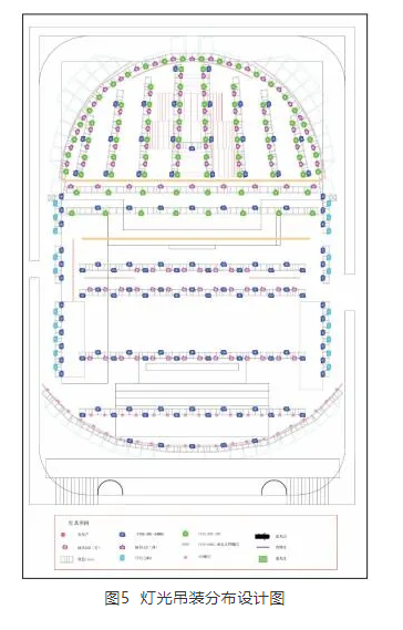 本次晚會(huì)節(jié)目均采用4K超高清攝像機(jī)錄制,畫面更加清晰,暗部細(xì)節(jié)更加豐富。為了更好地還原超高清電視畫面層次,根據(jù)空間的作用以及表演形式,在燈具選擇、照度以及布光角度等方面進(jìn)行反復(fù)推敲設(shè)計(jì)。在面光的選擇上,全部采用顯色指數(shù)90以上的光源,電腦切割燈作為晚會(huì)主光源,為保證錄制畫面一致性,每個(gè)表演區(qū)域照度在500 lx(±50 lx)且色溫為5 200 K(±100 K),光譜在可見光各個(gè)波長(zhǎng)上的能量相對(duì)均勻。作為對(duì)表演區(qū)的燈光補(bǔ)充,在觀眾席后方設(shè)置4臺(tái)高顯色追光燈作為補(bǔ)充。攝像機(jī)光圈設(shè)定在4.0左右,在全局布光設(shè)計(jì)的基礎(chǔ)上,主舞臺(tái)和格子空間分別使用電腦切割燈精確切出光照范圍,在格子空間里面使用LED線條燈(washwall),營(yíng)造色彩氛圍。觀眾席區(qū)域,每張圓桌正上方掛一個(gè)電腦切割燈,只對(duì)圓桌范圍進(jìn)行點(diǎn)光源布光,觀眾席后區(qū)使用LED帕燈進(jìn)行逆光渲染,并采用電腦切割燈做觀眾面光,確保每一個(gè)單獨(dú)的空間都有獨(dú)特的布光效果(圖5)。