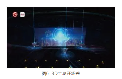 晚會(huì)開場(chǎng)秀選擇科技感較強(qiáng)的全息投影。虛擬影像與演員表演結(jié)合,營(yíng)造一個(gè)立體且有別于舞臺(tái)的另一魔幻空間,拓展真實(shí)舞臺(tái)空間的邊界,實(shí)現(xiàn)多元素的融合互動(dòng)(圖6)。為了保證畫面的整體性,此時(shí)燈光全部暗場(chǎng),全息投影產(chǎn)生的視覺盛宴,給觀眾帶來身臨其境的體驗(yàn)和視覺沖擊力。