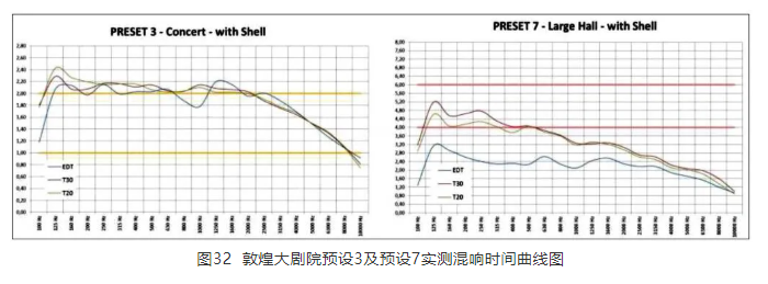 系統(tǒng)設(shè)置了8個(gè)預(yù)設(shè)模式,其中4個(gè)適用于獨(dú)奏、室內(nèi)樂和管弦樂,2個(gè)預(yù)設(shè)可應(yīng)用于歌劇和類似的場(chǎng)景,另外2個(gè)則為長(zhǎng)混響時(shí)間的特殊預(yù)設(shè)模式。這些預(yù)設(shè)中的5個(gè)又分為使用聲學(xué)反聲罩和不使用聲學(xué)反聲罩兩種情況,以更為細(xì)致準(zhǔn)確地滿足不同節(jié)目類型的需要。預(yù)設(shè)的混響時(shí)間分別為:1.4 s、1.6 s、1.8 s、2.0 s、2.2 s、2.4 s、3.2 s和5.0 s。根據(jù)使用需求不同,在改變混響時(shí)間的同時(shí),各預(yù)設(shè)的偏重也略有不同,可實(shí)現(xiàn)早期反射聲、混響聲比例以及明晰度指標(biāo)C80等多方面的調(diào)整。圖32即為預(yù)設(shè)3和預(yù)設(shè)7的實(shí)測(cè)混響時(shí)間曲線圖。