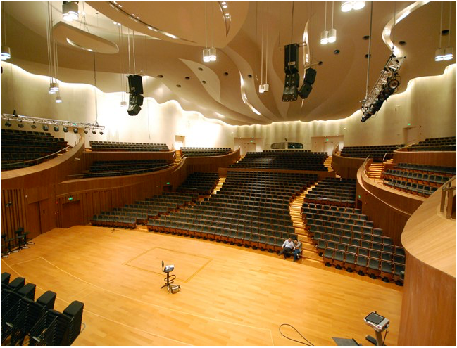 例如,江蘇大劇院音樂(lè)廳就主要采用的是線陣列擴(kuò)聲器,在場(chǎng)地較小、輔助擴(kuò)聲器較少的情況下也能覆蓋所有觀眾席位。
