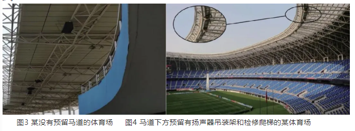 從調研情況來看,由于前期設計的不合理性,目前很多體育場館的揚聲器吊掛方式并不利于音響系統的使用與檢修,如圖3所示的體育場,其揚聲器直接安裝在了棚蓋桁架結構上,并沒有預留相關馬道,導致揚聲器的安裝和檢修都異常困難。因此,音響系統設計之初就應該加強與建筑設計等相關方的協同,要考慮到系統后續使用維護的需求。而圖4中所示的體育場是一個較好示例,它在每個揚聲器點位的馬道下方均有專門焊接的揚聲器吊裝架和檢修爬梯,便于工作人員進行檢修維護。