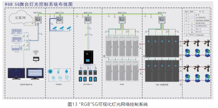 RGB的5G可視化燈光網絡控制系統(見圖13)將舞臺調光設備、燈光控制臺、網絡解碼器、配電柜和燈具等符合ArtNet、ACN和RDM 通訊協議的設備組成監控系統,可以遠程實時監控整個舞臺網絡設備狀態、布線狀態和每條線兩端設備連接狀態。