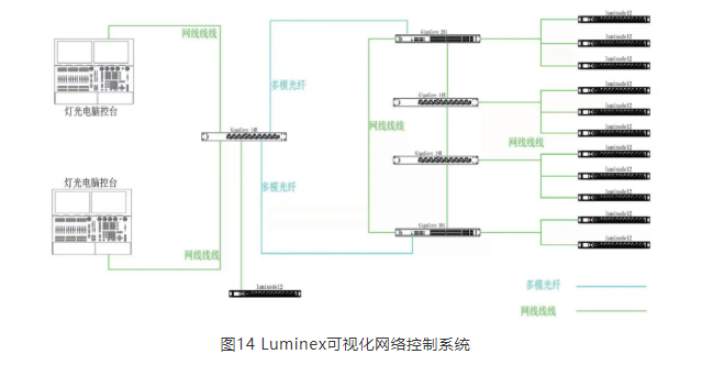 宏豐代理的比利時Luminex 可視化網絡控制系統(見圖14)采用網絡可視化軟件實現對Luminex 架構交換機、傳輸線路、備份線路、解碼器、周邊接入設備進行實時狀態管理,快速判斷故障點。系統可實現在線/離線設備總覽、網絡帶寬監測、ArtNet Universe監測,對ArtNet設備、發生器、日志、燈具等檢測,系統可感應報警、檢測設備故障,提供網絡沖突解決方案。