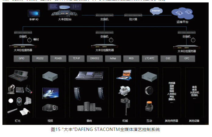 大豐DAFENG STACONTM演藝控制系統(見圖15)是典型的全媒體控制系統,包括綜合控制、智慧場館、運維管理三部分,同時承擔演藝現場總控、場地運營及設備運維管理等任務,可根據設備數量、類型、布局、優先級等靈活配置。系統具備大規模節點群控、融合實時同步、無限制cue表等功能,可在固定步驟演出中準確實現演藝設備全域控制,改變了傳統各專業獨立控制的模式,有效提高演出協同性。該系統支持TCP/IP、DMX512、MIDI、LTC、OSC、ArtNet、RS232、RS485、GPIO、OPC、PJlink等主流控制協議,具備豐富的設備數據庫,涵蓋燈光、音響、視頻、機械、互動、各種傳感器設備,并可以通過數據通訊模塊進行擴展。