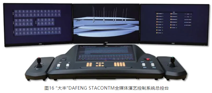 DAFENG STACONTM系統總控臺(見圖16)支持遠程控制管理、無縫維護、時間軸編輯功能,主機可自備份,保證演出數據安全。根據實際環境和使用要求,各子系統分別具備獨立的控制系統,可進行單獨控制,也可以集中控制,各子系統具備良好的兼容性和可擴展性。