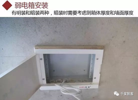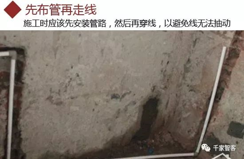 所有弱電線必須穿管敷設(shè),因此首先需要鋪裝線管,然后再穿線。然后安裝線盒,安裝面板等。最后封槽,注意封槽后的墻面、地面不得高于所在平面。安裝完成后記得清掃施工現(xiàn)場,清運垃圾。