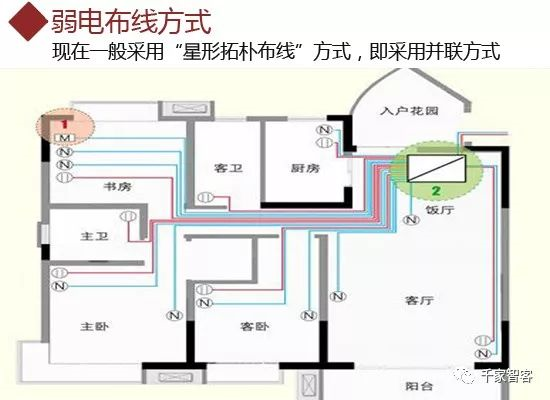 家庭弱電布線的絕大部分都是采用"星形拓樸布線"方式,即采用并聯(lián)方式,集中匯聚到弱電箱中實行集中管理。這是對過去"總線拓樸結(jié)構(gòu)"的代替,并聯(lián)強調(diào)的是每條線路都是獨立的,能夠避免單點故障導(dǎo)致整個系統(tǒng)的癱瘓,也方便單條線路進行拓展。