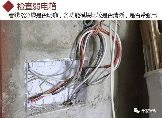 首先要檢查弱電箱,看線路分線是否明確,各功能模塊比較是否清晰。同時要特別注意弱電箱里面不能有裸露的強電,建議在弱電驗收的時候帶上一只電筆,避免工人將強電誤裝到弱電系統(tǒng)上。