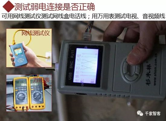 弱電驗收最重要的就是檢驗弱電連接是否正確,無斷路也無短路。網(wǎng)線和電話線測試的時候,需要用到網(wǎng)絡(luò)測試儀,根據(jù)儀器操作說明判斷線路是否連接正確;而有線電視線、音視頻線、音響線的測試需要用萬用表測試通斷;其他的弱電線路,則建議采用相應(yīng)的專業(yè)儀表測試。
