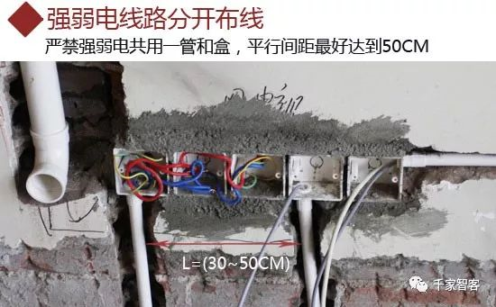 電路改造時一大禁忌,就是施工隊為了施工方便,將所有線路收納到一起。這樣做的后果是線路之間會受到干擾,導(dǎo)致信號不穩(wěn)定,而且還會留下火災(zāi)隱患。因此在電路改造的時候,強弱電應(yīng)該分開走線,嚴(yán)禁強弱電共用一管和一個底盒,強電線路平行間距不能低于30cm,最好是50cm,交叉必須成直角。