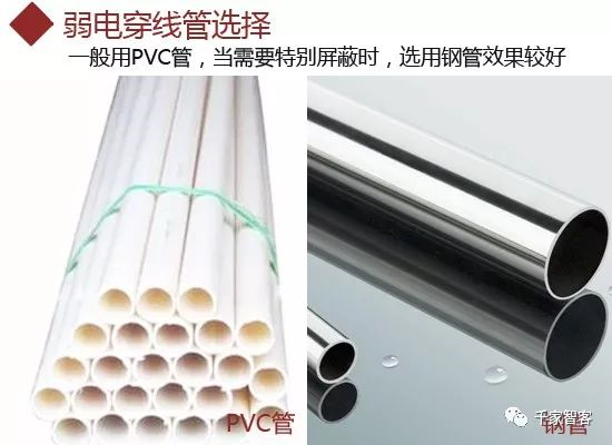 弱電所穿線管應(yīng)采用鋼管或硬質(zhì)PVC管,PVC管價格相對便宜,比較常用,但是對信號屏蔽效果沒有銅管好。因此,如果所步線路存在局部干擾源,且不能滿足最小凈距離要求時,應(yīng)該采用鋼管作為穿線管。