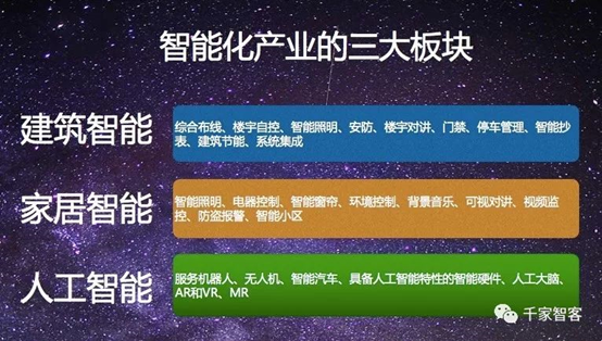 千家智客認(rèn)為,當(dāng)今的智能化產(chǎn)業(yè)應(yīng)該包含了建筑智能、家居智能、人工智能三大板塊,其中建筑智能又指智慧建筑,包括綜合布線、樓宇自控、智能照明、安防、樓宇對(duì)講、門(mén)禁、停車(chē)管理、智能抄表、建筑節(jié)能、IBMS、系統(tǒng)集成等;家居智能即智能家居,涉及智能照明、電器控制、智能窗簾、環(huán)境控制、背景音樂(lè)、可視對(duì)講、視頻監(jiān)控、防盜報(bào)警、智慧社區(qū)/智能小區(qū)等;人工智能包括服務(wù)機(jī)器人、無(wú)人機(jī)、智能汽車(chē)、具備人工智能特性的智能硬件、人工大腦、AR和VR、MR等。