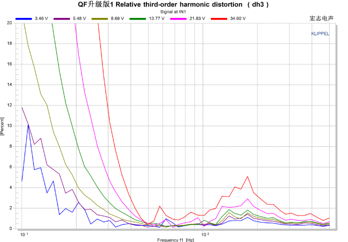 上圖是一個(gè)喇叭的輸入電壓跟失真的關(guān)系圖,不同顏色的線代表不同電壓,可以看到,隨著輸入電壓的增大,失真跟著增加。