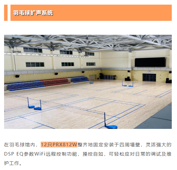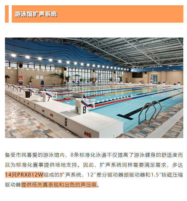 此次為城西區體育公園籃球館、羽毛球館和游泳館打造的擴聲系統全部采用美國JBL PRX800智能有源揚聲器系統,更智能、更響亮、更穩定的技術優勢為市民的日常健身氛圍和重大賽事的舉辦提供高質量支持。