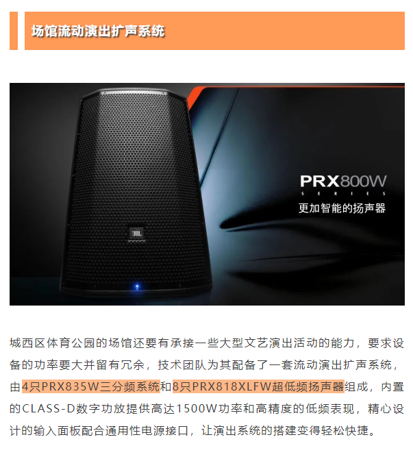 美國 JBL PRX800智能有源揚聲器系統入駐西寧市城西區體育公園場館