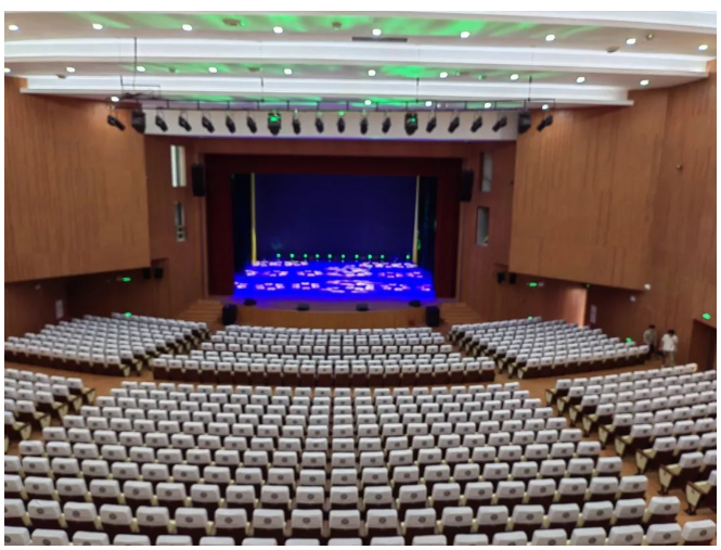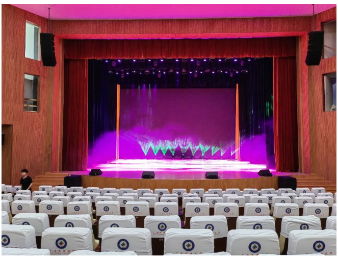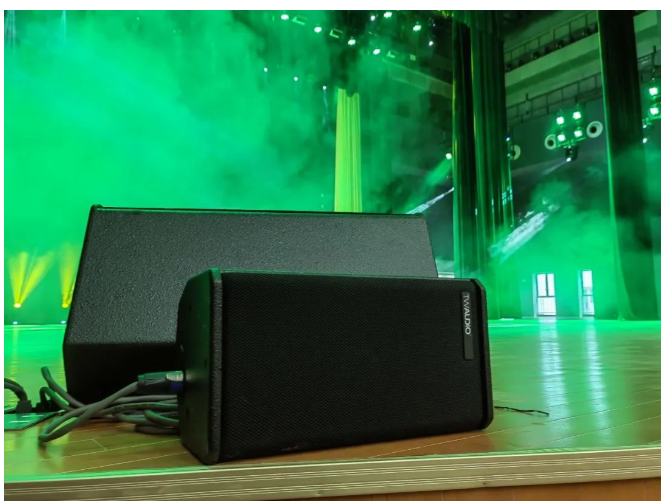 其中主擴聲系統采用德國TWAUDiO VERA20i 雙10寸線陣列揚聲器12只以左右兩組吊掛在舞臺上方,搭配4只 VERA32心形指向超低音揚聲器。