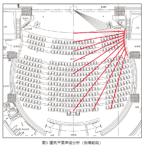 編鐘具體位置尚不明確,聲線分析時,暫定聲源位于臺口線中央。建筑平面聲線分析(側墻前段)見圖3,建筑平面聲線分析(側墻中后段和后墻)見圖4。