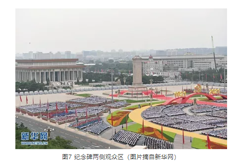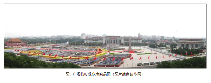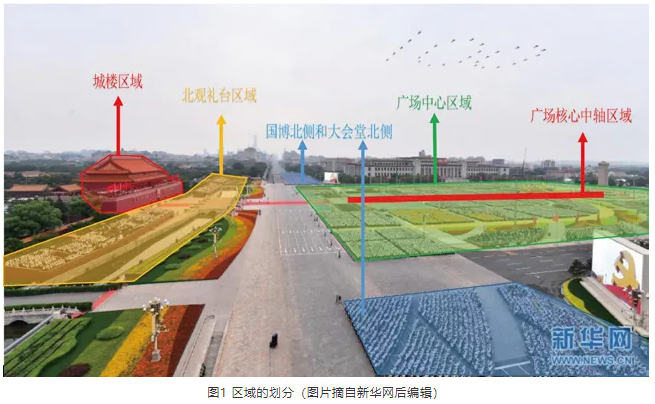 廣場區(qū)域主要包括北臨長安街中線位于獻詞團兩側(cè)的觀眾席,南至紀念碑,西至廣場西側(cè)路,東至廣場東側(cè)路。這個區(qū)域也是觀眾數(shù)量最多、最集中的地區(qū)。