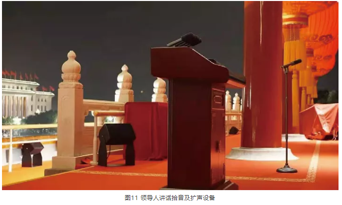 天安門城樓區(qū)域的擴聲系統(tǒng)主要包括:演講臺周邊返送揚聲器系統(tǒng)、城樓大殿前區(qū)擴聲揚聲器系統(tǒng)、東西城臺擴聲揚聲器系統(tǒng)、城樓下音效揚聲器系統(tǒng)等。