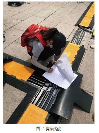 由于廣場地區(qū)的座椅、設(shè)備、線纜大部分都是為本次活動臨時搭設(shè)的,為了滿足流動拾音及擴聲、電視轉(zhuǎn)播、新聞報道及其他各指揮部的信號傳輸及用電需求,現(xiàn)場需要臨時敷設(shè)大量的強、弱電線纜,如圖12、圖13所示。而這些線纜與現(xiàn)場觀眾及演職人員的進出場通道存在交叉,無論是對各部門的系統(tǒng)安全還是現(xiàn)場人員的人身安全都有一定隱患。同時,大會進、撤場時間十分有限,特別是大會結(jié)束后,現(xiàn)場所有流動系統(tǒng)設(shè)備包括線纜必須在1.5 h內(nèi)全部撤除完畢,撤除過程中不能與人員、工程車輛、設(shè)備設(shè)施等產(chǎn)生交叉和沖突。
