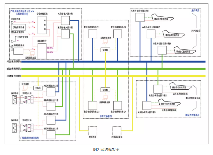 音響系統(tǒng)共設(shè)置5個功能子系統(tǒng),包括:負責(zé)音頻信號傳輸和交換的“音頻傳輸網(wǎng)絡(luò)”;負責(zé)控制和其他信號交換的“數(shù)據(jù)傳輸和指揮網(wǎng)絡(luò)”;負責(zé)現(xiàn)場聲音信號拾取的“現(xiàn)場拾音系統(tǒng)”;負責(zé)提供現(xiàn)場擴聲服務(wù)的“現(xiàn)場擴聲系統(tǒng)”;負責(zé)國際聲信號制作的“國際聲制作及多聲道錄音系統(tǒng)”。