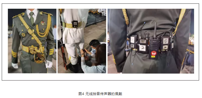 國旗護衛(wèi)隊的口令、抽刀、腳步的拾音使用的是有線+無線的方式。從人民英雄紀念碑到國旗桿之間280 m,有線拾音傳聲器沿紅毯沿線均布,同時,在紀念碑臺階和國旗座附近分別設(shè)置了用于拾取抽刀和配槍的效果聲傳聲器。無線拾音傳聲器佩戴于護衛(wèi)隊的胸口、靴子、腰帶上,如圖4所示,傳輸系統(tǒng)采用四分集技術(shù),保證信號的安全可靠。通過現(xiàn)場實時的頻率監(jiān)控,有效屏蔽干擾信號。