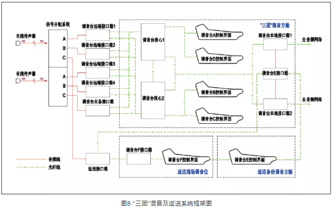聯(lián)合軍樂團、合唱團、獻詞團分別由1 314人、2 974人、1 068人組成,大會期間承擔(dān)前期合唱熱場以及青少年致獻詞的環(huán)節(jié)。“三團”混音及返送系統(tǒng)設(shè)置了近200個通道的傳聲器拾音,利用傳聲器分配系統(tǒng)直接送入在“三團”附近的調(diào)音臺網(wǎng)絡(luò),并實現(xiàn)分區(qū)域返送,如圖8所示。現(xiàn)場和混音方艙內(nèi)的調(diào)音臺系統(tǒng)之間通過光纖以雙星型網(wǎng)絡(luò)連接,所有信號從拾音、傳輸?shù)交煲舳紝崿F(xiàn)了主備冗余。