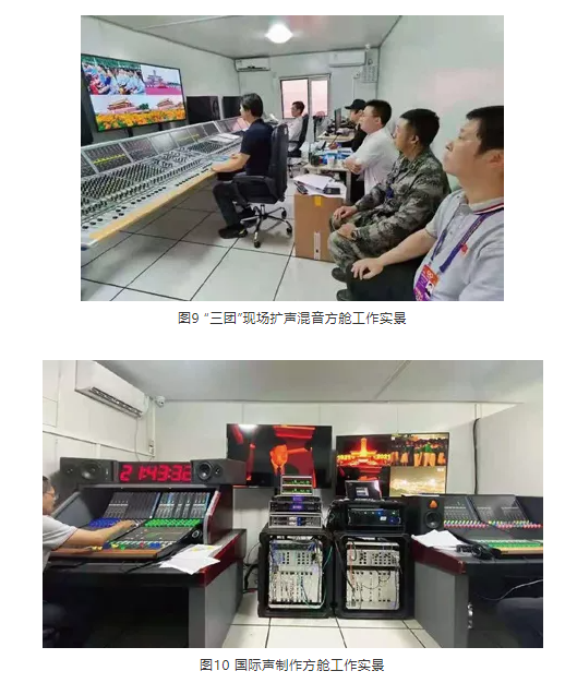 由于音響系統(tǒng)的各工作點位相對分散,且功能需求不同,除了幾個相對固定的機房,本次活動中還臨時搭建了幾個工作“方艙”,如國際聲制作混音方艙、“三團”混音制作方艙及在廣場觀眾席后方搭建的現(xiàn)場混音方艙等。