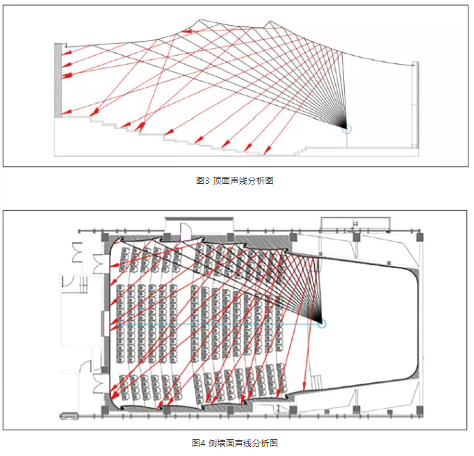 建筑體型優(yōu)化方面,在空間建筑布局已定的情況下,通過裝飾手段優(yōu)化建筑體型,為觀眾席提供充足的早期反射聲。